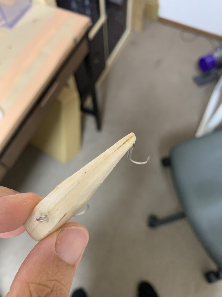 メタルバイブのように浮き上がりやすいのです。物理的な事は分かりませんが、薄くした事でメタルバイブのように巻いた際に浮き上がりやすくなりました。これがとても使いやすい!9gスローシンキングとなったプロトは水深1mくらいの野池だと、丁度良い感じです。バルサはプラ製と違って浅いレンジに設定しやすく、さらにボディの厚みで調整が効くことが分かりました。一気にバイブレーションの理屈が分かった気がしました。次の形状が頭に浮かびました。