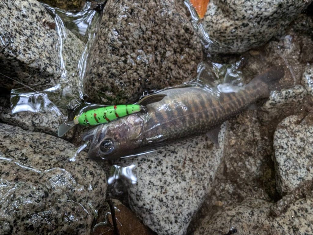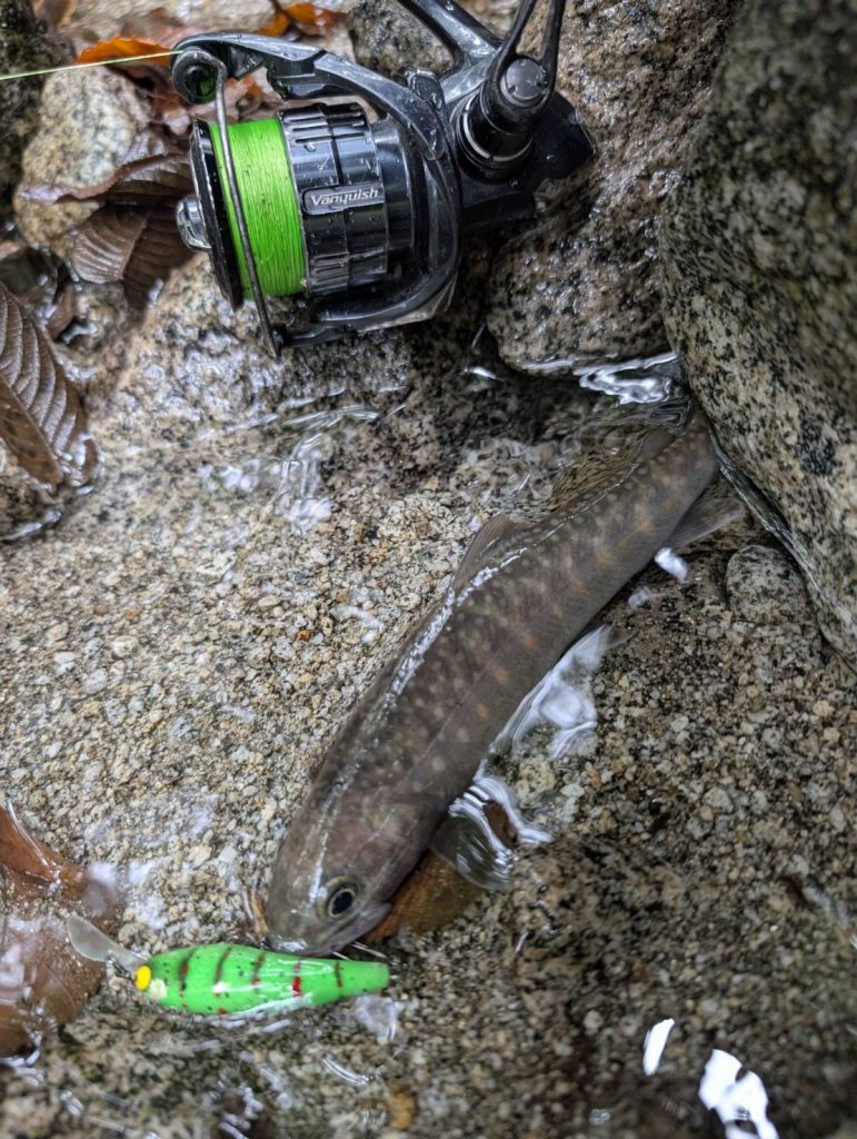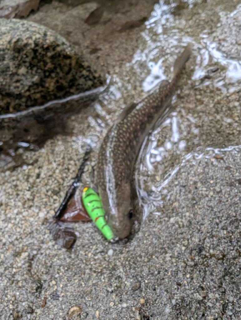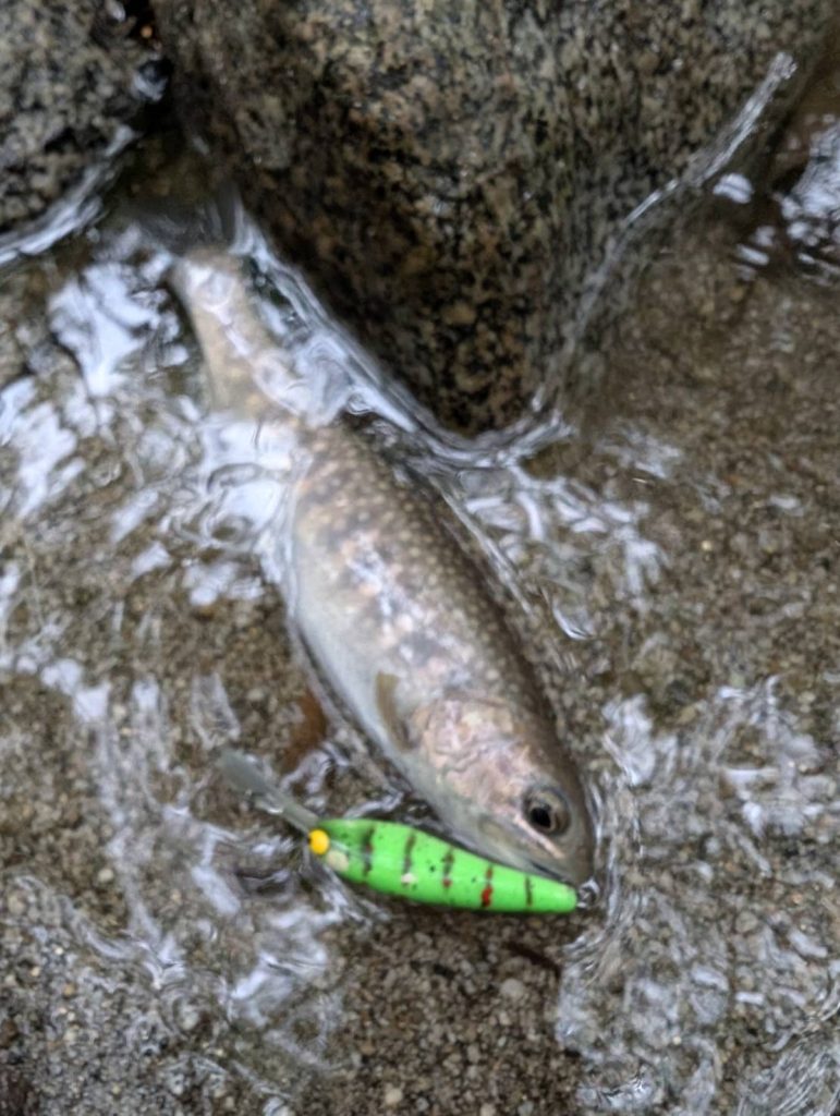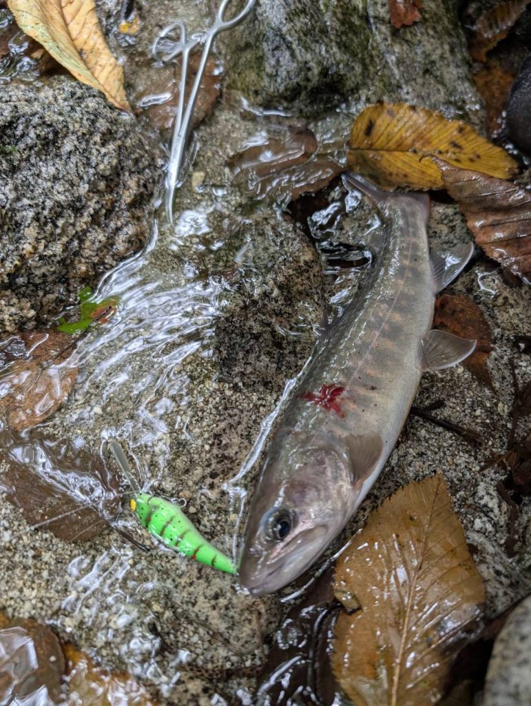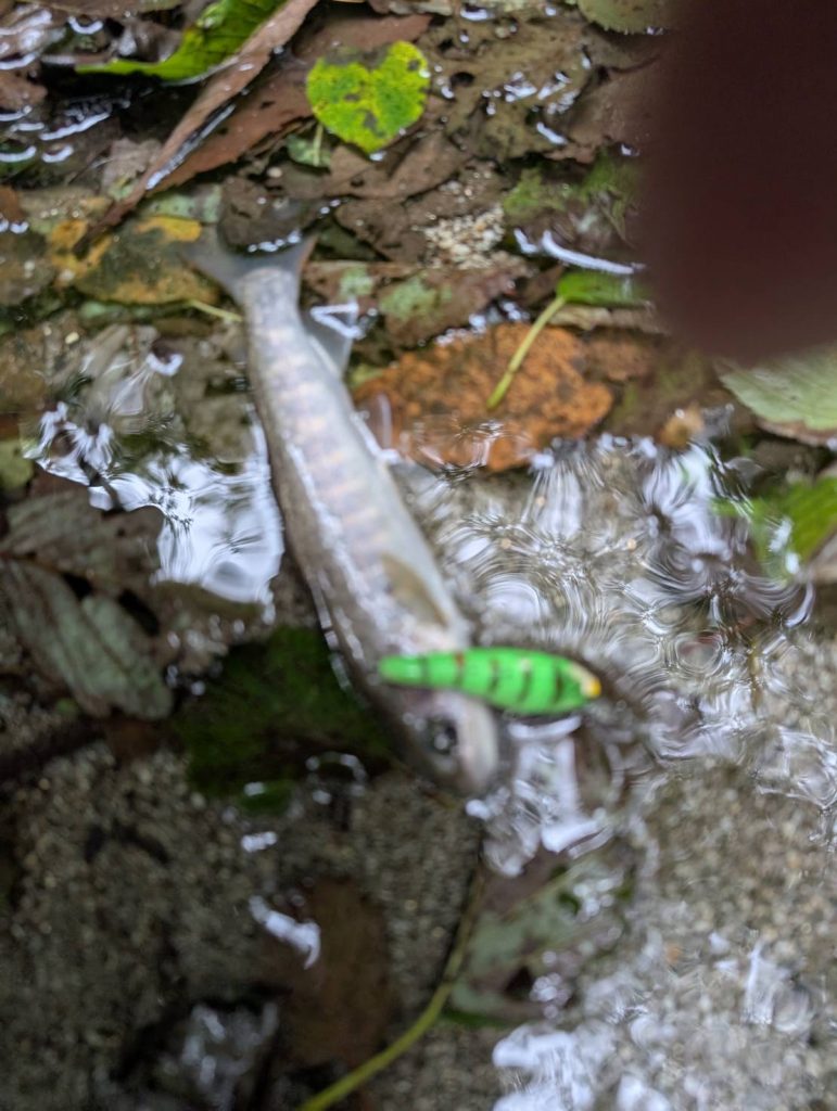 この渓流は先日自分も入りました。その際にはこういった釣果は出なかったのですが、また日が違うと魚の状態が変わるなぁ?と思っています。イモムシカラ―、その川でイモムシを見たことはないのですが、おおよそ虫を意識して食ってきている気がしてます。こういったカラーでの釣果は嬉しいですね。