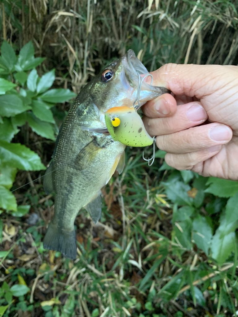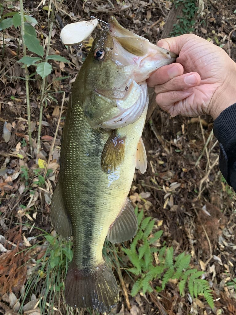 足元でコン!とルアーが止まったと思ったら、バスでした。