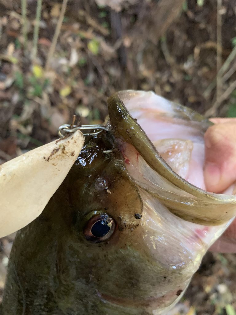 実際に使ってみると、意外とフォールが遅い。まぁ使えなくないけど、そもそも水深1.5mの野池だと厳しいかな。ボトムではどうかな?ゴミを拾わずに動かせるはずだけど・・・うん、大丈夫。ボトムでちょんちょんすると、ヒラヒラ動いていい感じでした。イメージはボトムにいるギル。